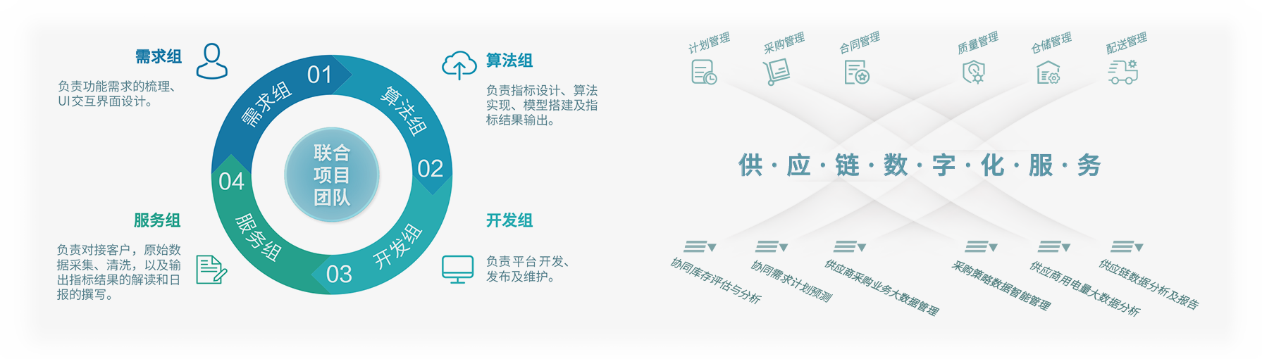 以“業(yè)務(wù)+技術(shù)”的工作模式,派駐數(shù)字化服務(wù)團(tuán)隊(duì)與客戶開展聯(lián)合辦公,通過提供業(yè)務(wù)診斷、工具開發(fā)、數(shù)據(jù)清洗、模型訓(xùn)練等服務(wù),幫助客戶將物聯(lián)網(wǎng)、人工智能、大數(shù)據(jù)分析等前沿技術(shù)嵌入其核心業(yè)務(wù)流程,助力客戶企業(yè)以更快速度、更大規(guī)模推動(dòng)供應(yīng)鏈發(fā)展與變革。